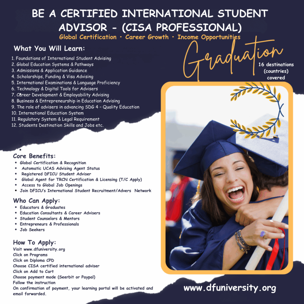 Your passport for study destinations. Work with DFICU, UCAS, TRCN, ICEF and global Education Communities – Universities, Colleges, Polytechnics, Business and Professional Organizations.